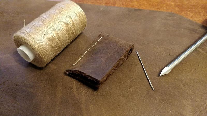 Turns out that common household tools can get the job done, but it's not fun at all. The pyramid-tipped woodworking awl makes undesired incisions in the leather. A conical awl with a more acute point would work better. It's hard to push the needle through, and now the needle is bent. The thread? Well, it was the best combination of thickness and strength that I had on hand. And how much easier it would have been, if I had the special fork-like tool that makes a row of evenly-spaced holes to put the thread through.
