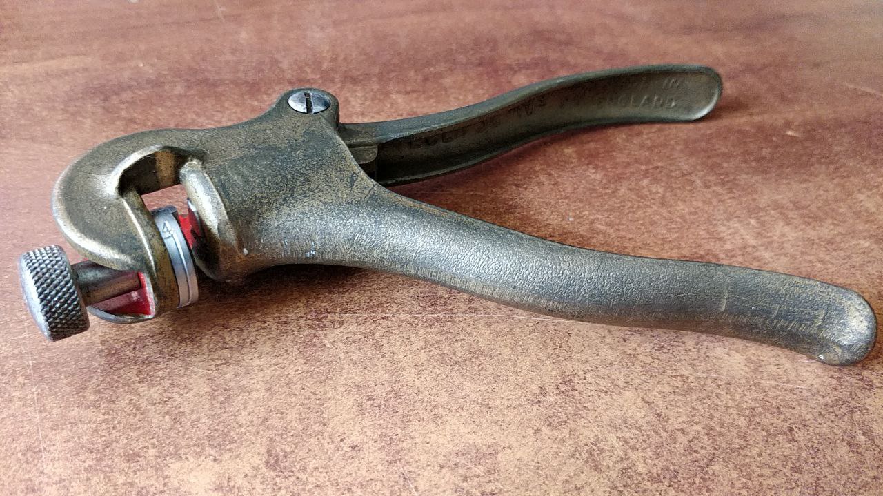 It is amazing how much thought went into designing and producing a seemingly simple tool such as this. The body is made of bronze which is soft enough to avoid damaging the saw, but still quite robust. It is cast, not stamped from sheet metal as is the case with cheaper tools. The interior part is painted red for better contrast (you have to align the tooth visually, after all). There is an adjustable anvil that allows repeatability and consistency across the whole length of the saw. And when the handles are squeezed, one jaw immobilizes the saw blade, then in the same fluid motion, a small hammer presses the tooth against the anvil, bending it outwards slightly.