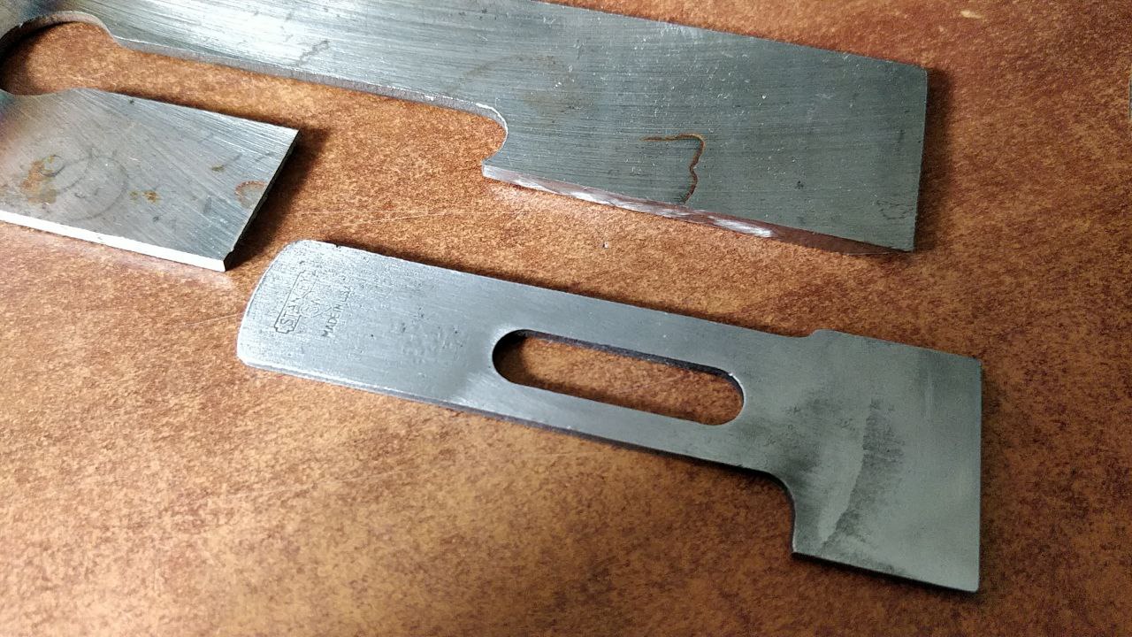 Still, I'm not going to camber the original blade, because I have the materials to fabricate a new blade. There's a chunk of a bigger plane iron and its shape is close to what I need. Also, the material is quite thick.