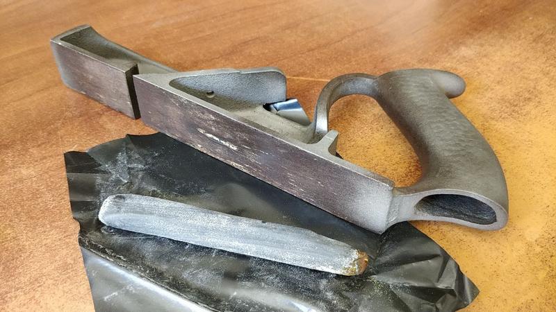 The handle of this plane is part of the casting. It is hollow inside and has a little hole on the top and a bigger hole on the bottom. For no reason other than aesthetics, I decided to fill the holes with some putty and sand everything down.