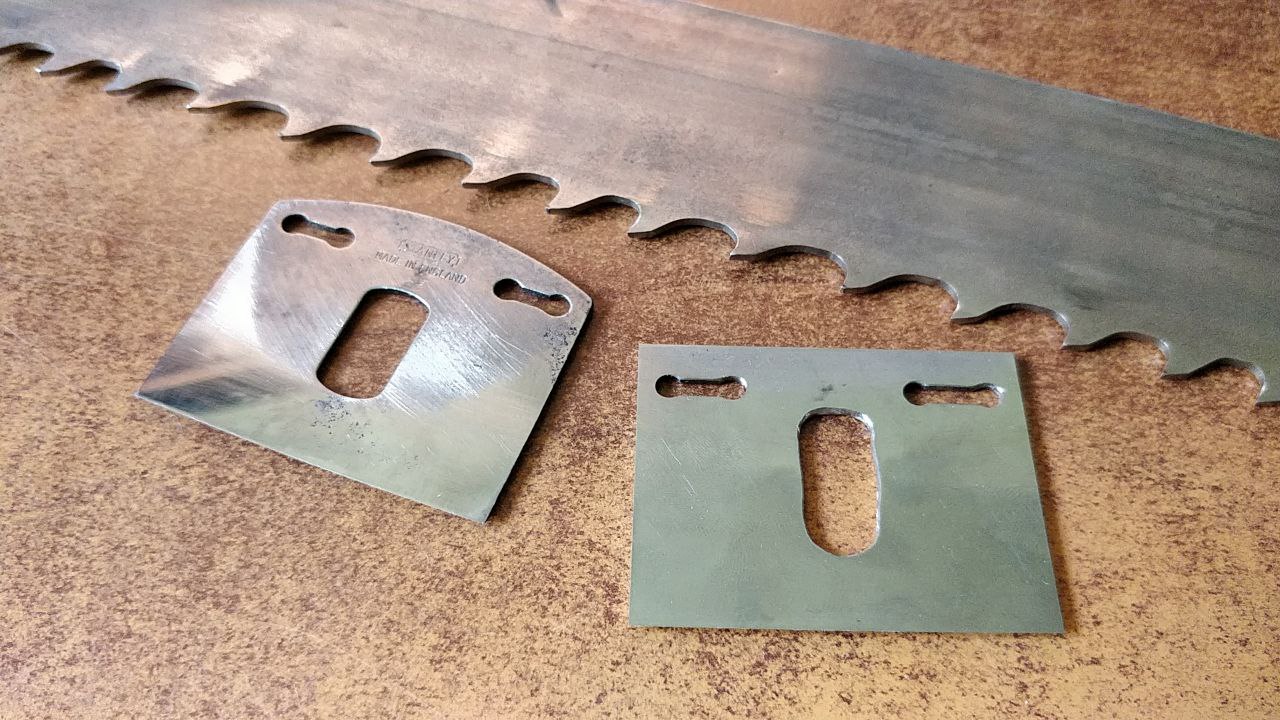 Fortunately, I had materials: a fully and uniformly hardened industrial saw blade. Unfortunately, I had no means of annealing, and then hardening and tempering the blade, so I resorted to cutting and shaping the rock-hard metal using diamond and tungsten carbide tools.