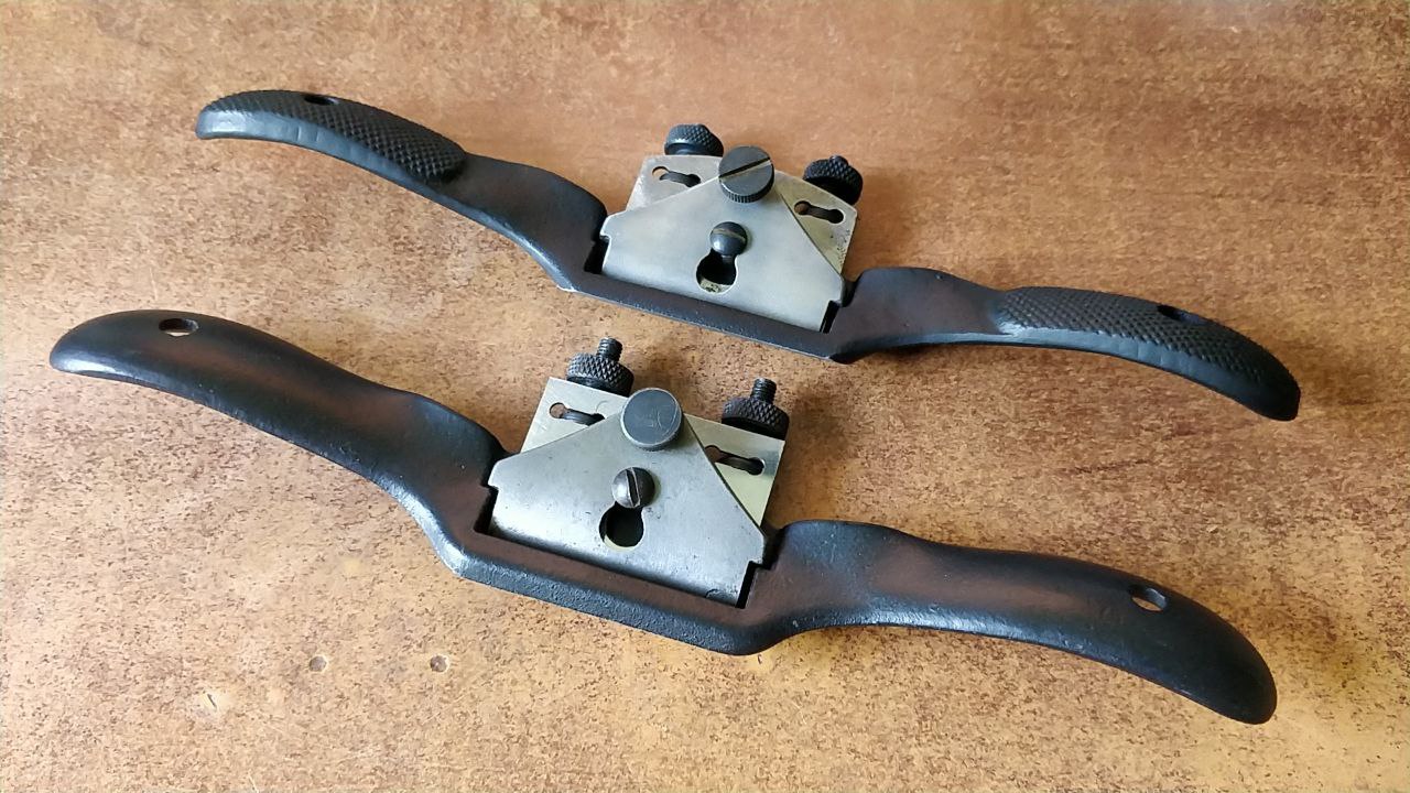 Both spokeshaves are marked as made in England, so I imagine they are the later models, especially the curved piece with the grooving pattern on its handles. If I were to guess, I'd say they were made in the 1980s. They are a useful addition to my toolbox, good for chamfering edges and working on curves and other complex shapes.