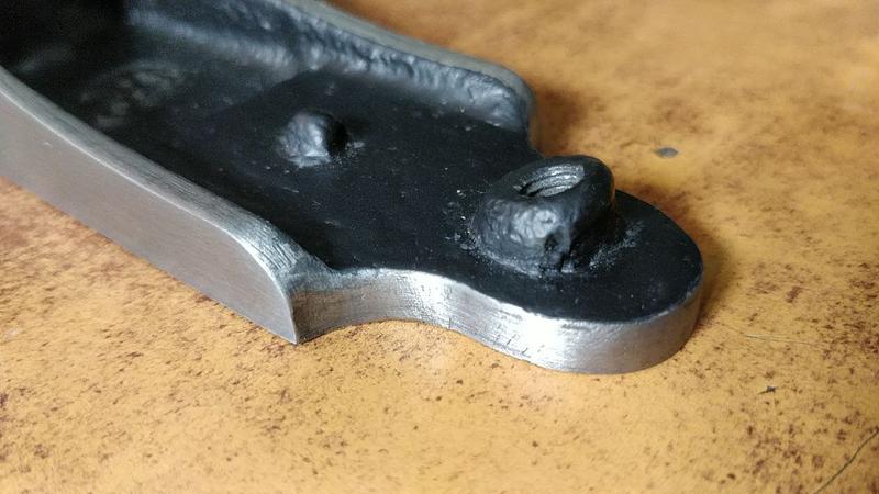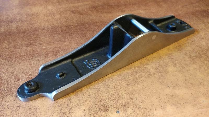 I was considering filling the hole in the casting that the original owner had drilled out. I had the option of filling it with a piece of iron and peening it on both sides, or using some epoxy filler, or even cutting off the part of the plane with the hole, making it slightly shorter in the process. In the end, I decided to just leave the hole be. Once this project is done, I'll see if I even want to have a scrub plane. If I find it useful, I just might get a similar plane with a better body casting to restore.