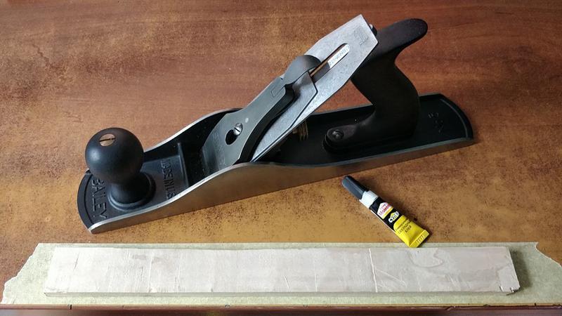 Since I have no workbench and no vice, I had to somehow attach the thin strip of maple to the table to plane it smooth (and flat). Painter's tape and superglue to the rescue! I don't claim I've invented this trick, but now I know it works really well!