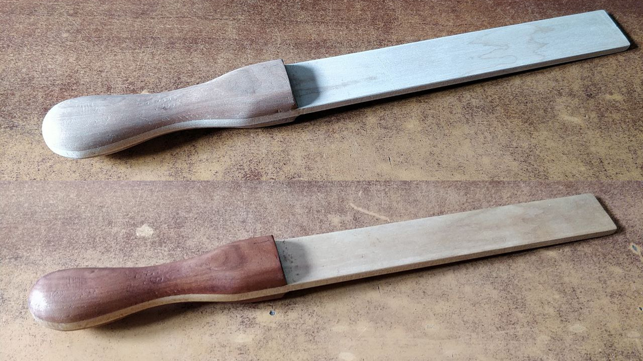The handle was shaped with a very coarse rasp, then smoothed with a file and some sandpaper. I did not bother removing all the rasp marks, as this is a practice piece after all.