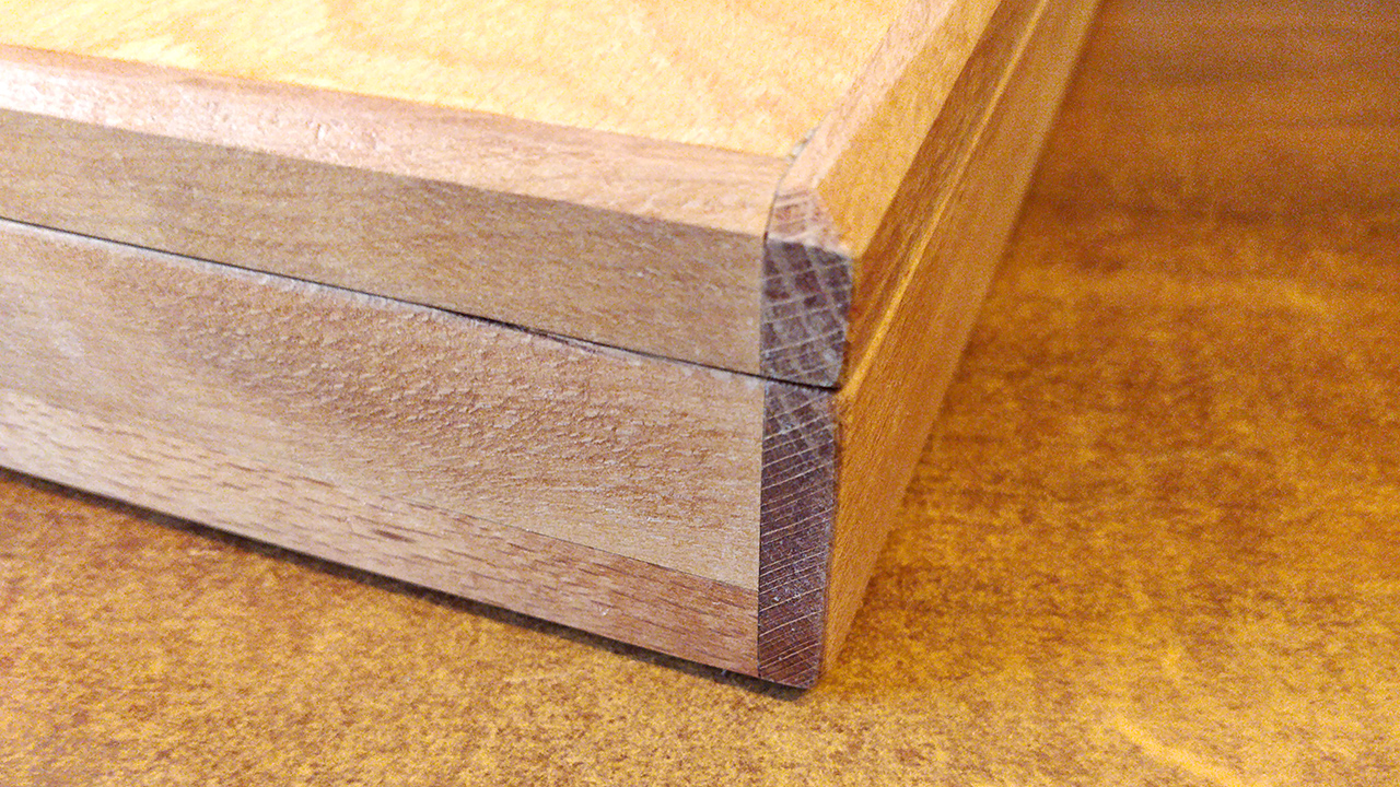 With the hinges in place, I disassembled the box again and chamfered the visible edges. There is a certain charm to these somewhat uneven, hand-cut chamfers. With the chamfers cut, the box was treated with some oil-varnish blend and left to dry. Since it was pretty cold here, the box took a long time to dry, so for now I decided not to do a second coat. I might add another coat later. The advantage of an oil finish is that it can be easily reapplied again with little to no preparation.