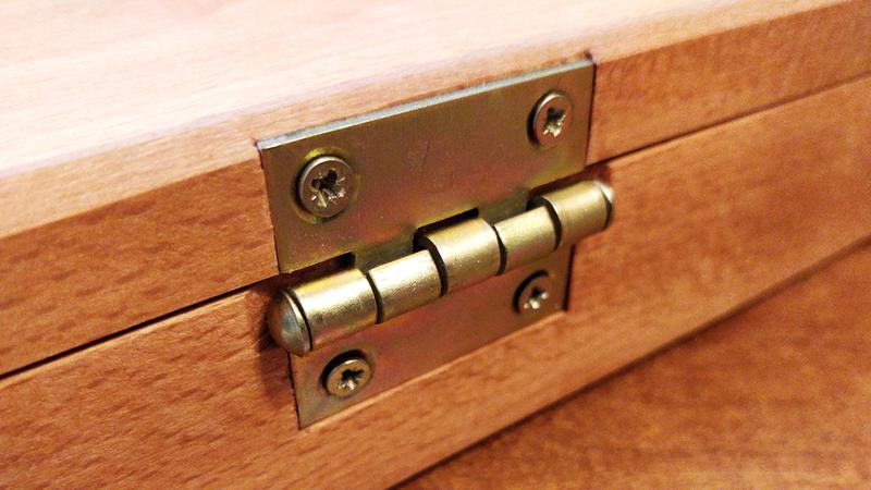 Then came the time to install the hinges. I wish I could find better hardware for the box. There were two kinds of hinges available: either flimsy, light-duty stuff intended for arts and crafts, or really big, heavy hinges suited for doors or maybe crates. I had to settle on these, the smallest of the heavy-duty kind.