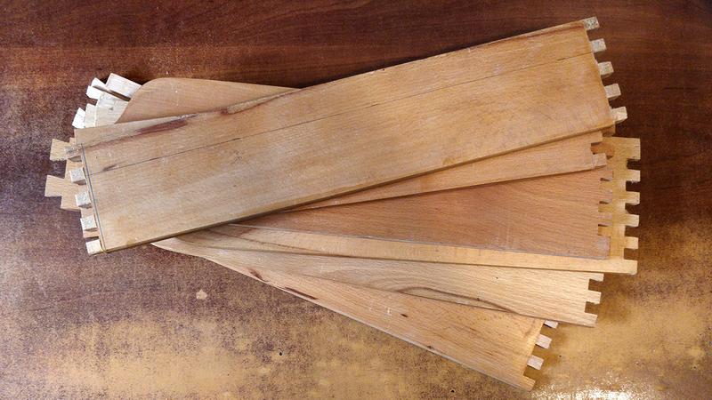 The box was made from reclaimed wood, some drawers from an old cabinet. It looked like beechwood to me, and the plywood bottom was actually veneered to match the drawer sides. Unfortunately, some boards were laminated together from several narrower pieces, but there was enough material to get by.