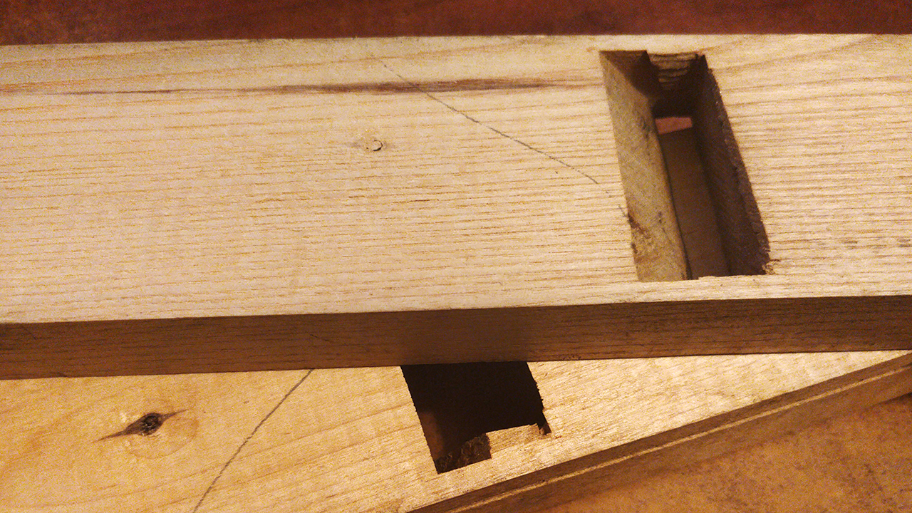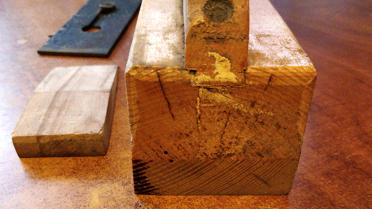 As a result, there is a small gap between the boards. It is only a matter of time until this joint fails, so I pop it open with a chisel. The boards separate neatly.