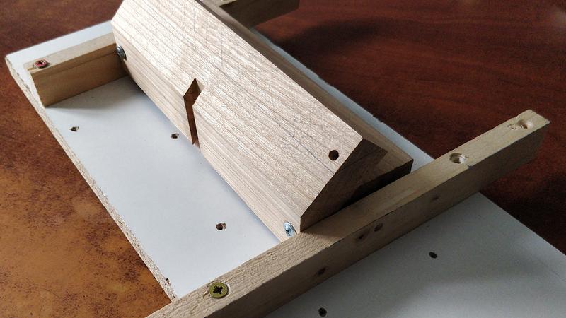 With this conductor, I was able to accurately drill the holes that are used to hold down the blade. I then tapped some M6 thread right into the wooden body and screwed in the threaded studs. Replacing the metal plate that holds down the blade with a wooden part worked out well. I made the wooden plate slightly convex so it puts the wingnuts in tension.