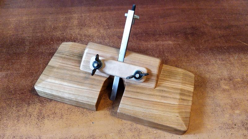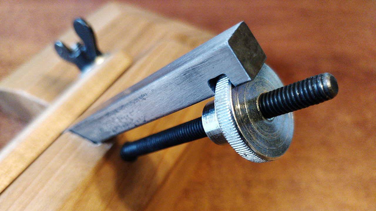 Even with the spring-loaded clamp, it is difficult to achieve the ideal pressure for the blade, which must be adjustable but still hold firmly. My current approach is to loosen one of the screws, adjust the blade, and then tighten it back. The adjustment is surprisingly fine despite the standard pitch on the M6 bolt. Unfortunately, the threaded hole on the adjustment nut is not perfectly square to the flange, but I have no lathe to fabricate a better-fitting part.