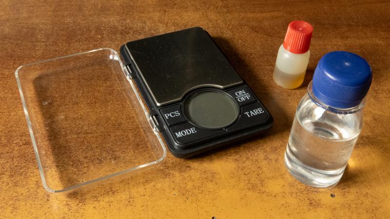 This was my first time measuring epoxy by weight, and it proved to be a successful experiment. For my application, the volumetric ratio is 1 part hardener to 5 parts resin, but considering the differing densities of the two components, the weight ratio is 1:6. Although measuring the hardener from its bottle proved challenging due to its viscosity, I initially poured out roughly 0.3 grams of hardener, obtained an exact weight reading from the digital scale, and then added six times that amount from the resin bottle. Since there's significantly more resin than hardener, any minor error in resin quantity has a less pronounced impact on the result. After spending approximately 10 minutes thoroughly mixing the epoxy, I proceeded to attach one of the walnut blanks to the blade.