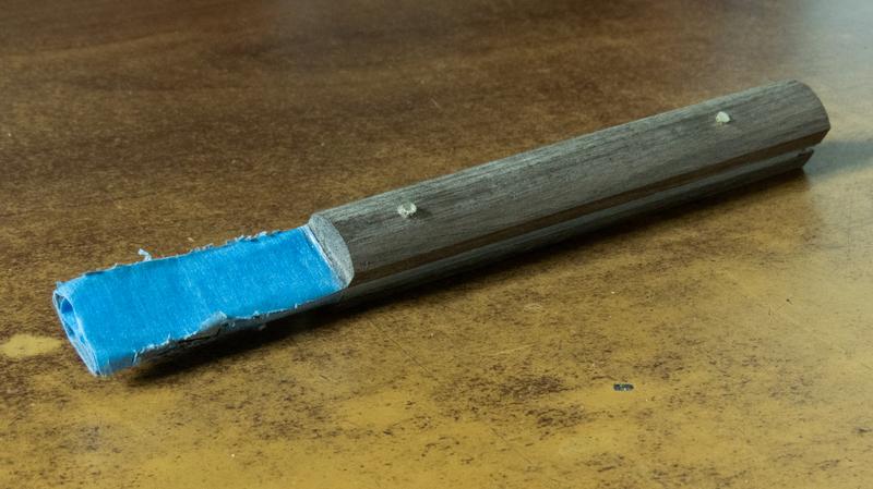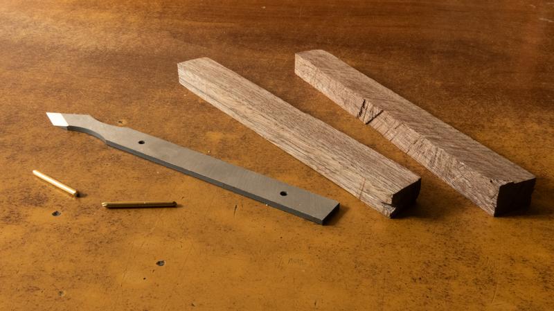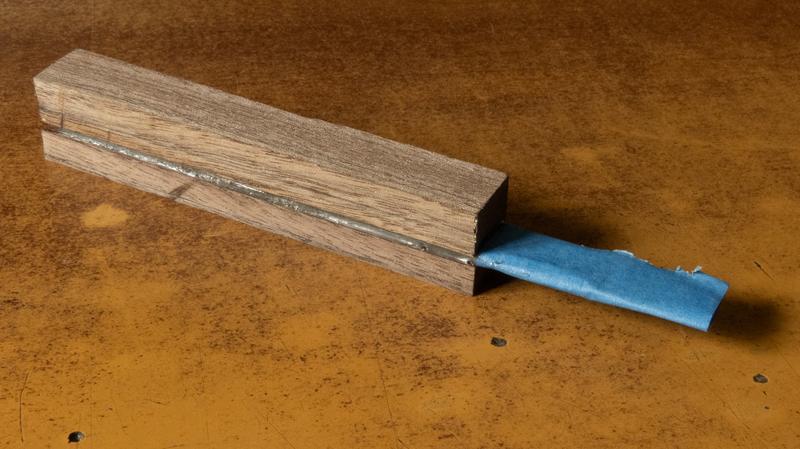 To my surprise, the blade came exceptionally sharp right out of the box, so I decided to polish it just a bit. Afterward, I covered the sharp end with tape and scuffed the blade with coarse sandpaper. I had also prepared two small pieces of walnut to serve as scales for the knife. I flattened one side of each walnut blank for gluing to the blade, with the intention of shaping the rest after the glue-up.