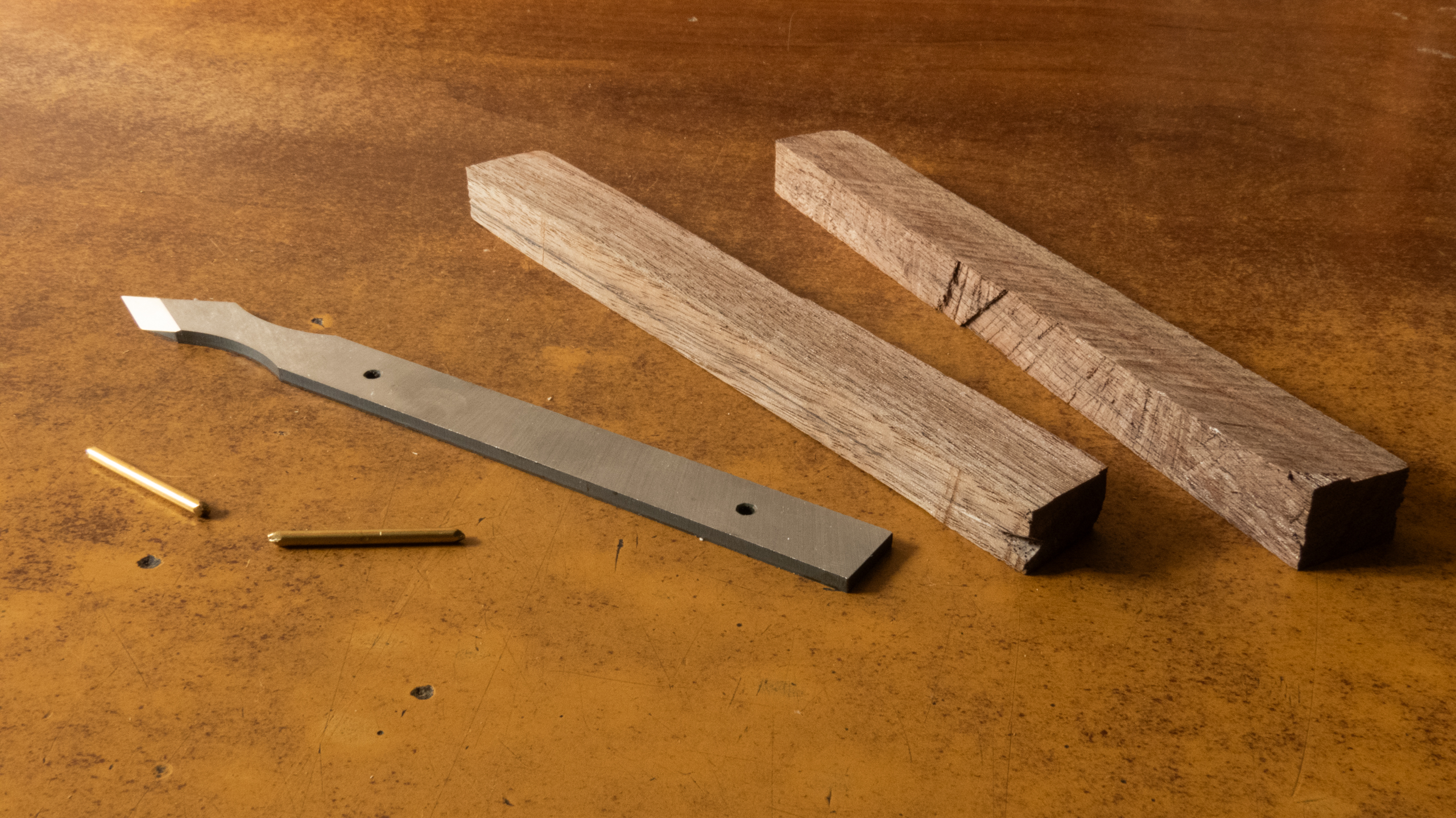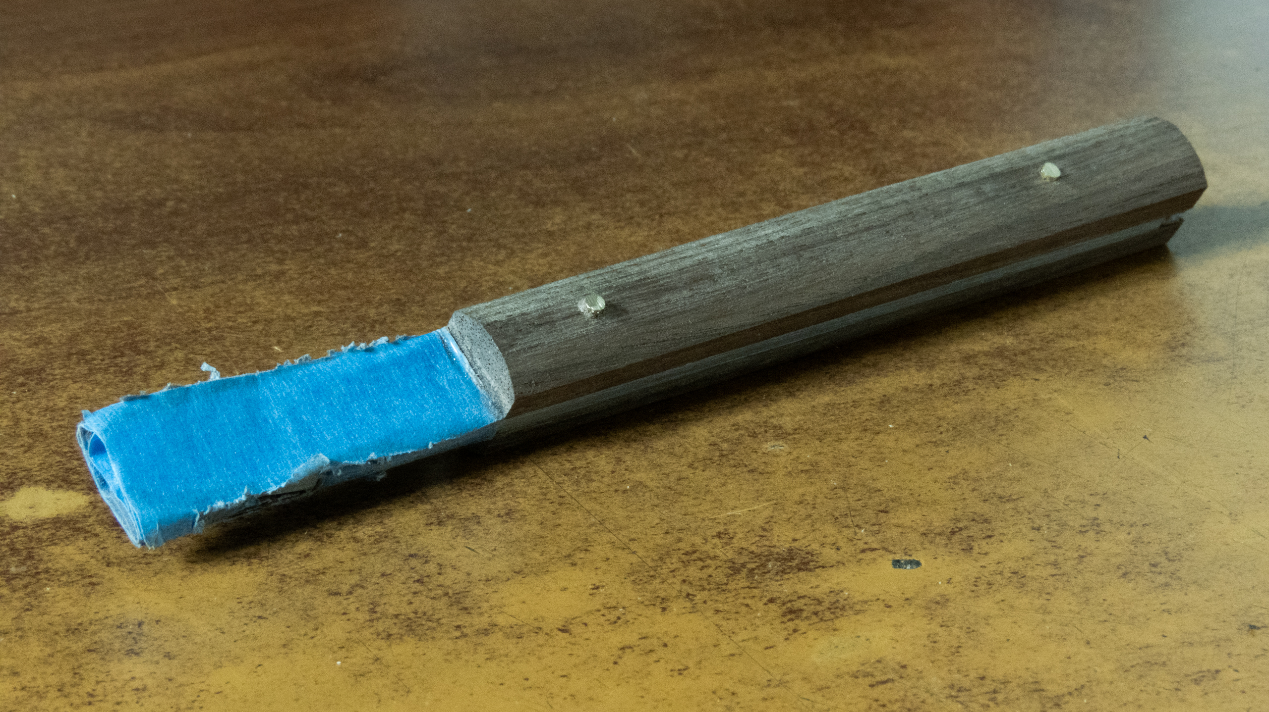 The following day, the epoxy had solidified, although it still felt somewhat pliable to the touch. I proceeded to drill the holes for the brass rods in the walnut, using the holes in the blade as a guide. It's worth noting that a drill press would have been quite helpful in this step. The hand-drilled holes did end up slightly off square, but given the thinness of the wooden parts, the deviation isn't critical. With the holes in place, I prepared another batch of epoxy and secured the second wooden piece.