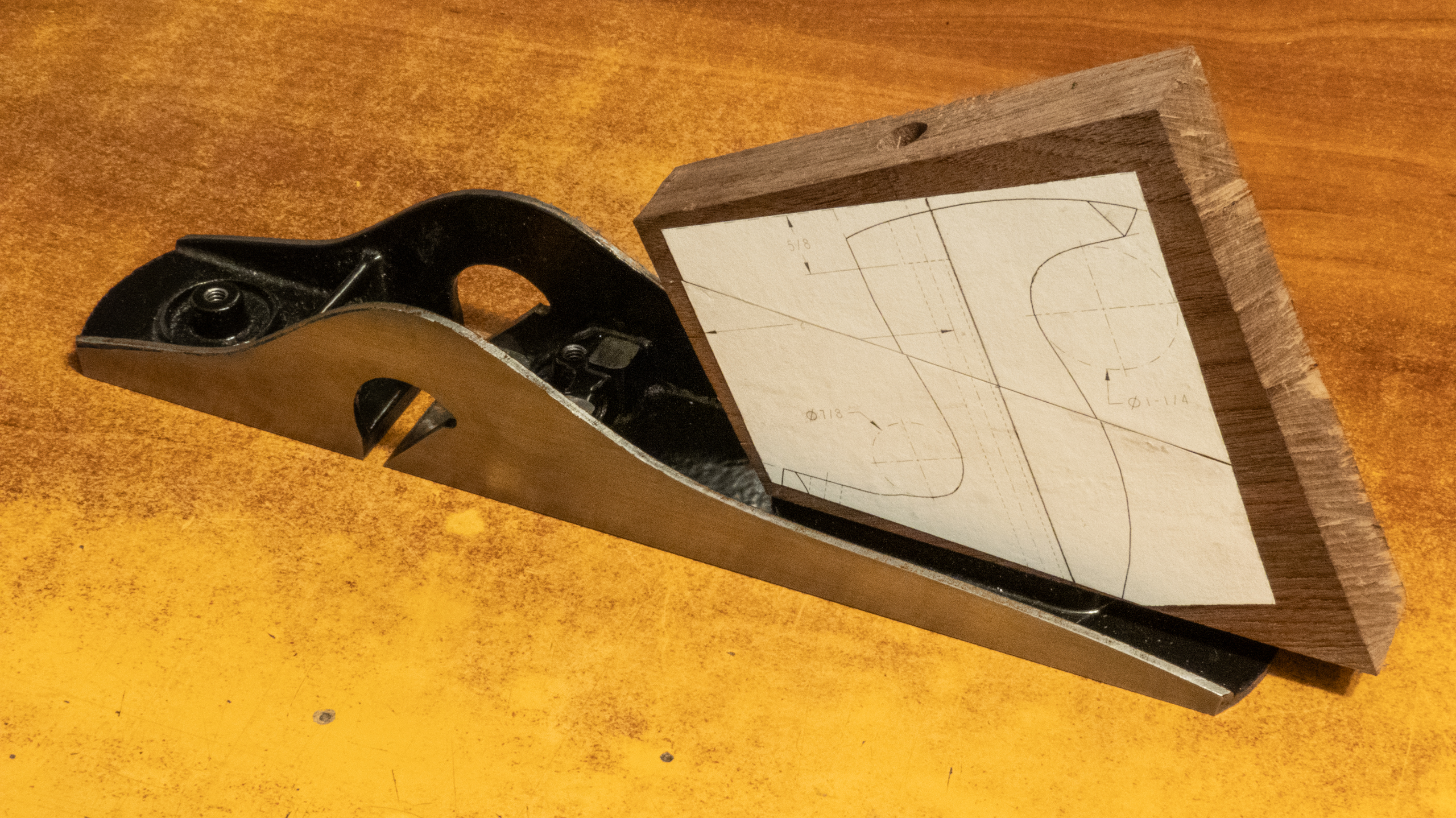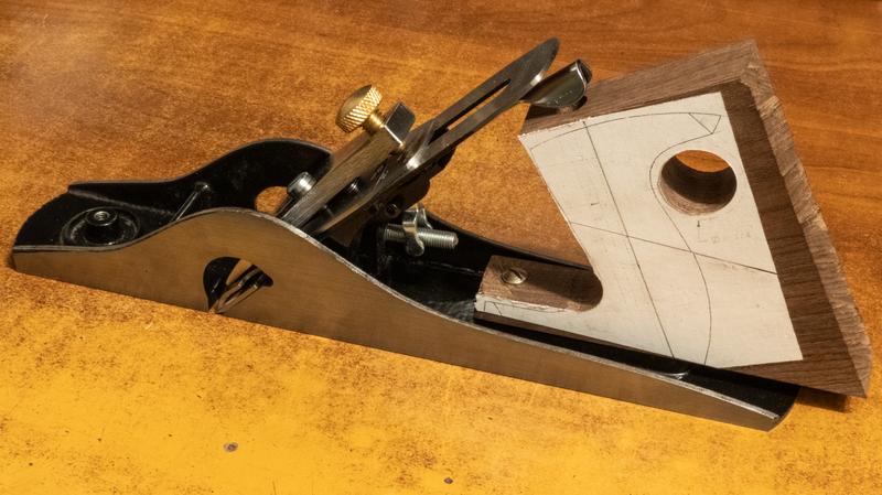 Now, I needed to work around the features I had already established: the angled hole and the bottom. I began by using the template for the Stanley #5 tote, making adjustments as the height and angle were slightly different.